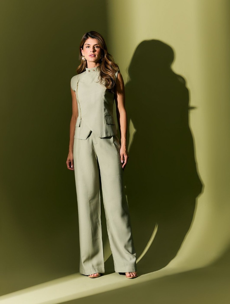 Calça na alfaiataria com det. Prega frete, modelagem pantalona.