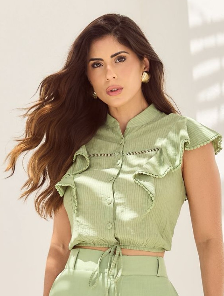 Croped crepe com textura tapeta com botões cobertos gola padre detalhes entremeio Gripir busto maga em jabour com detalhes em Gripir e barra em elástico com amarração.