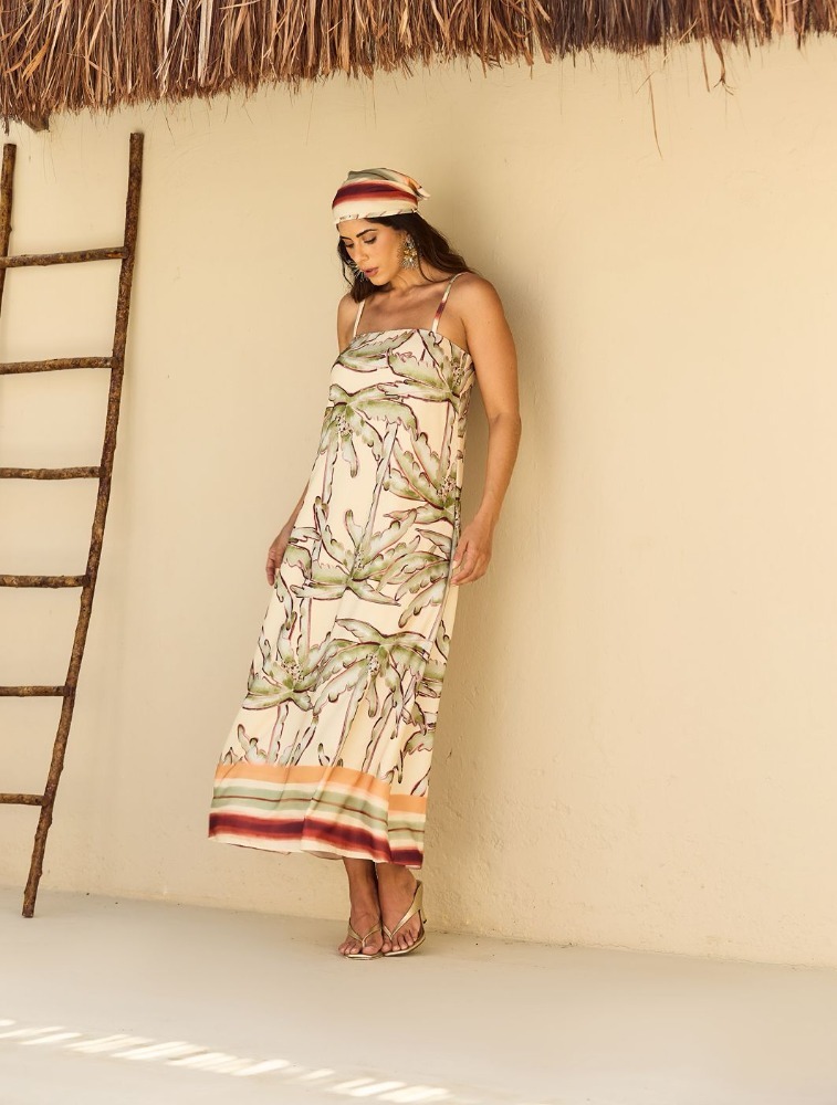 Vestido no tecido twill com decote reto alças com regulador barrado em